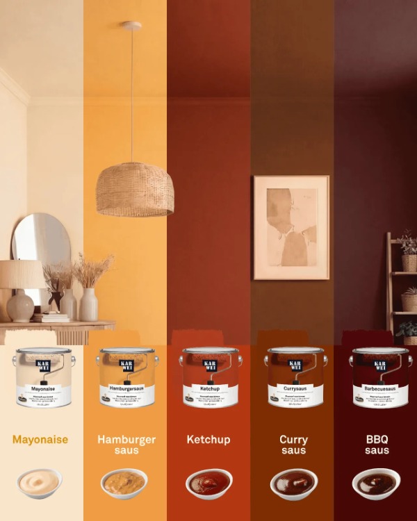 Karwei heeft samen met Oliehoorn een opvallende verflijn bedacht, geïnspireerd op smaken als currysaus, ketchup en mayonaise. Vertrouwde smaken, maar ook herkenbare kleuren. Want wie wil er nu géén woonkamer in een subtiele mayonaisetint? Alles bij elkaar ziet het er in ieder geval verrassend geloofwaardig uit.