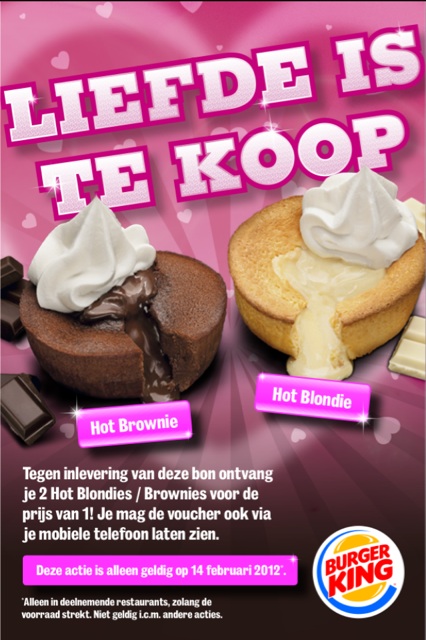 Met de slogan: romantiek uit de automatiek biedt Smullers een mooi voorgerecht “want romantisch uit eten hoeft niet lang te duren“. Dat is maar goed ook anders missen we de trein. Want vervolgens gaan we voor het hoofdgerecht naar een Kwalitaria in Breda voor een hamburger voor 2 personen in hartjes vorm. Voor mij niet naast de deur maar Kwalitaria Breda heeft voor vrouwen zelfs een roos bij dit diner. Het nagerecht doen we op de terugweg bij de Burger King (bijvoorbeeld in Amersfoort), waar we een heerlijke Hot Brownie of Hot Blondie scoren. Het motto liegt er niet om: “liefde is te koop!”
