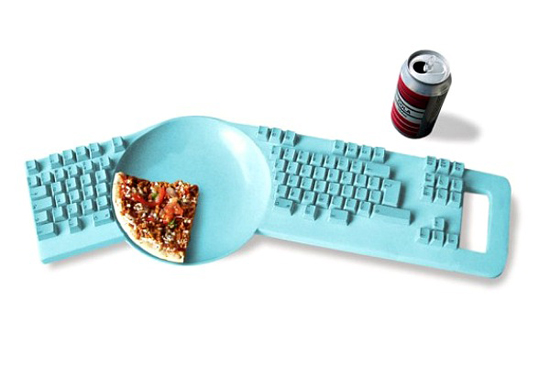 Gelukkig is er iets op gevonden: een keyboard met ingebouwd bord dat volgens de makers ook in de vaatwasmachine kan. Daardoor kan ik gewoon door blijven computeren terwijl ik pizza aan het eten ben. Een uitstekende uitvinding want zo kan ik al mijn bezigheden combineren. Het keyboard is bedacht door Hella Jongerius.