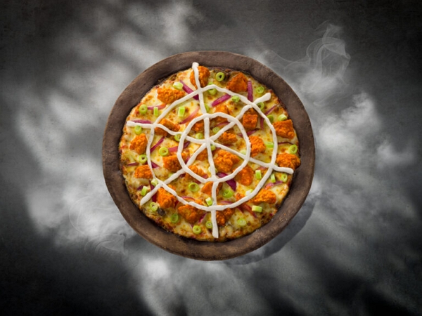 De pizza combineert malse stukjes kip gemarineerd in Buffalo hot sauce met rode ui, lente-ui, tomatensaus en romige mozzarella. Daarbovenop wordt een spinnenweb van looksaus gespoten, wat zorgt voor een unieke afwerking. De pittige kip en smeuïge kaas vormen samen een intens smaakduo. Op het eerste gezicht lijkt de pizza misschien aangebrand maar de zwarte kleur van het deeg komt volledig uit natuurlijke ingrediënten. Door een vleugje zwarte cacao toe te voegen, krijgt het deeg zijn diepe kleur en aroma – zonder dat dit de smaak beïnvloedt.
