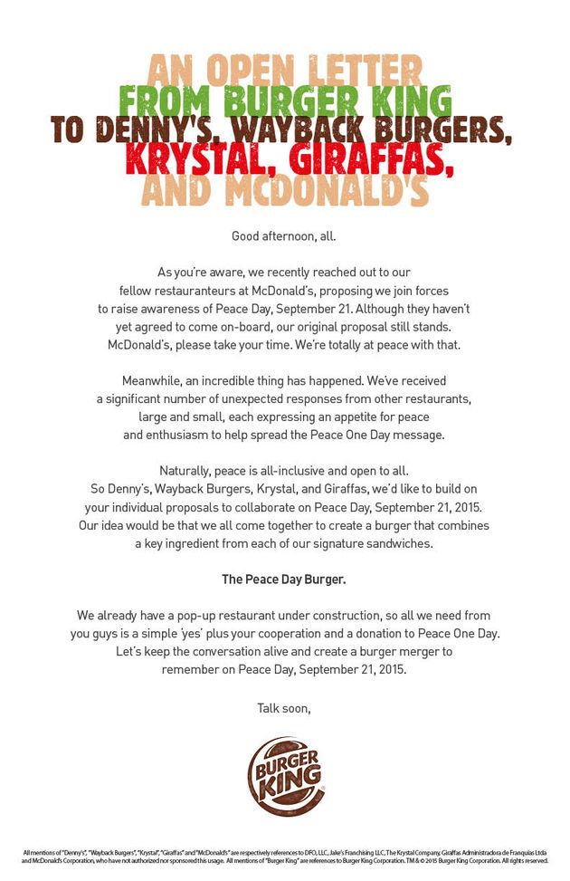 Burger King heeft veel positieve reacties gehad op het idee van de McWhopper, ook van andere fastfoodketens. Via een brief aan Denny’s, Wayback Burgers, Krystal en Giraffas laat het bedrijf weten dat ze graag samen werken op de dag van de vrede. Ook McDonald’s krijgt nog een kans. Het idee van Burger King is dat alle ketens hun belangrijkste ingrediënt combineren en er een burger van maken.