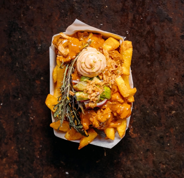 Deze variant brengt de Indonesische keuken naar de frituur. De frites worden geserveerd met pittige rendang, chili-limoenmayo, mosterdblad, krokante gebakken uitjes en een frisse mix van pickles. Een kneepje limoen zorgt voor balans in deze kruidige, aromatische creatie.